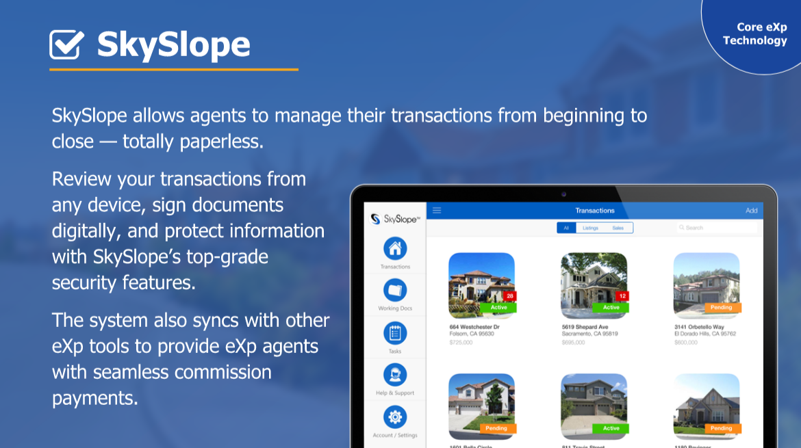 This system is simple and efficient. What else would you eXpect from eXp Realty - The Agent-Owned Cloud Brokerage? Skyslope integrates with Zip Forms and Digisign and also has mobile capability. Much more user-friendly than the last brokerage I was with!